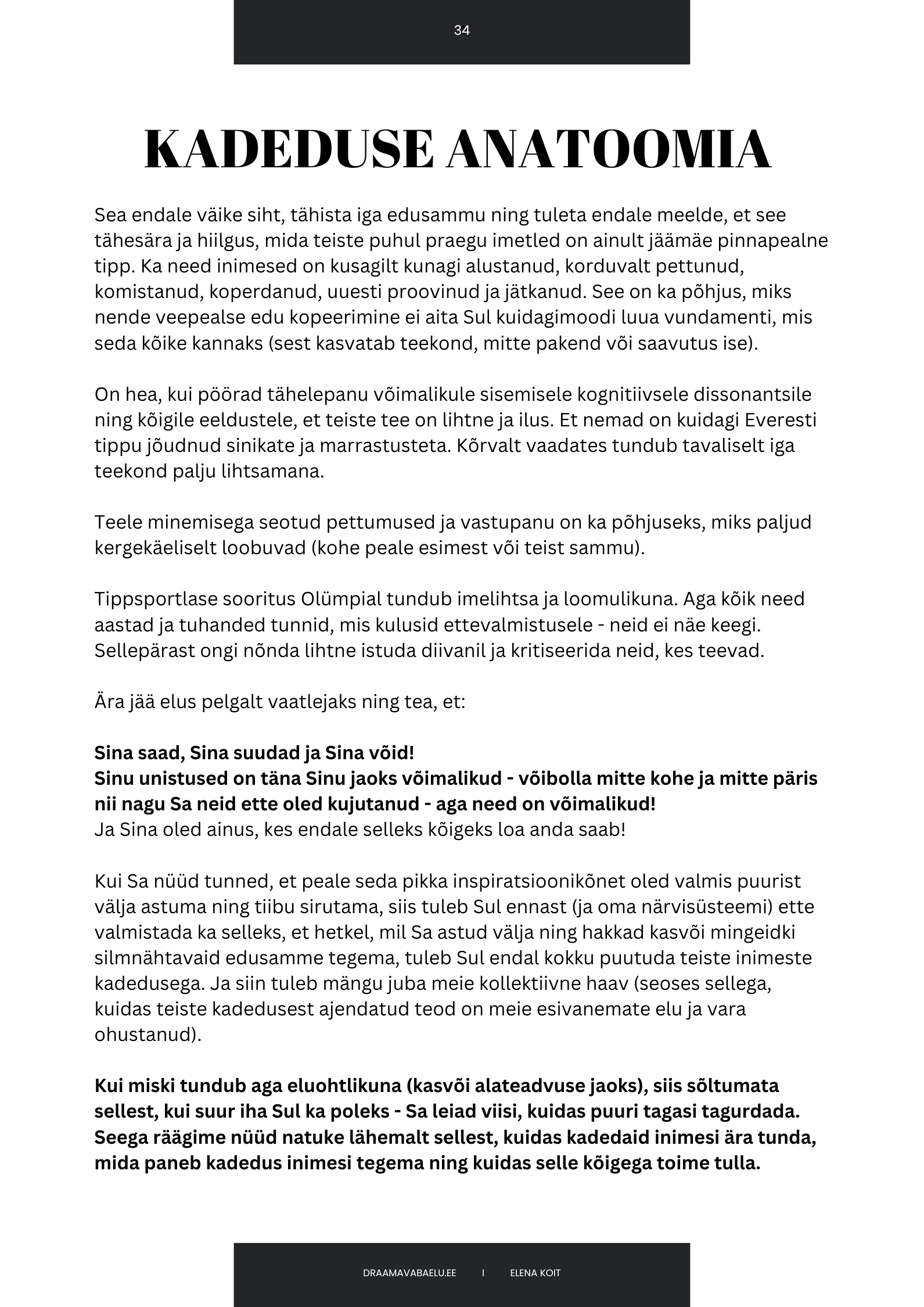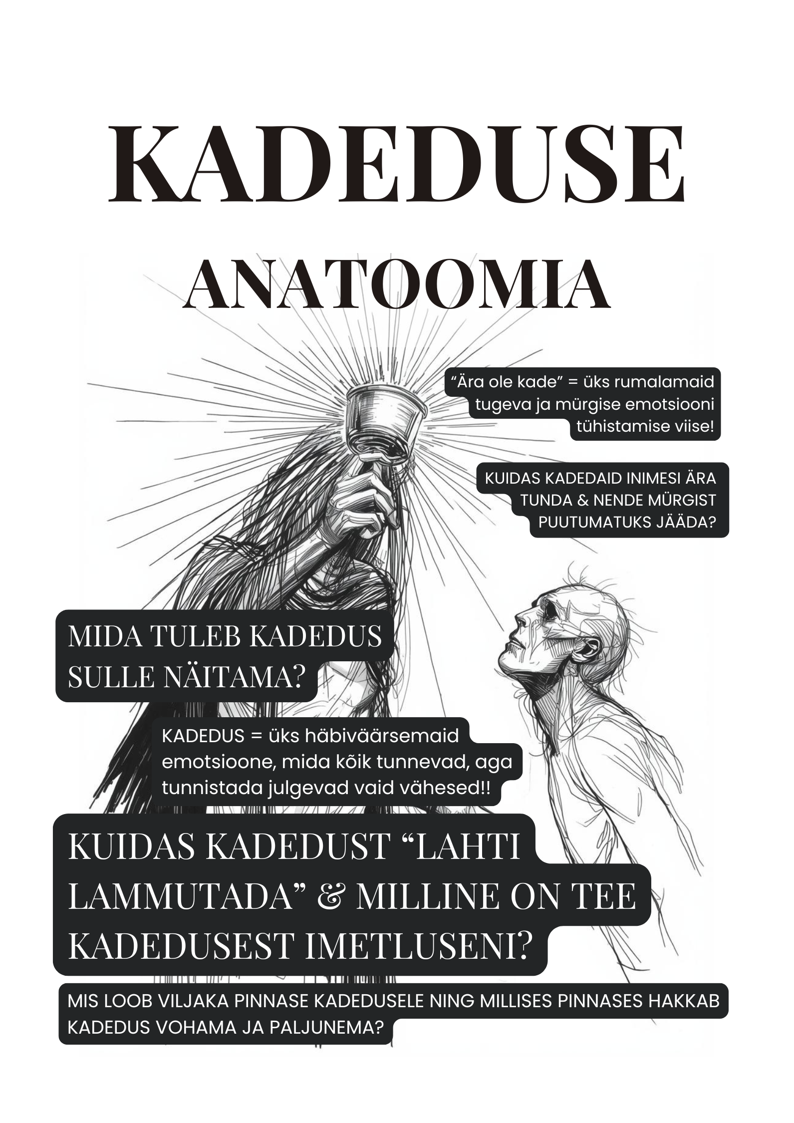 Kadedus on salakaval, häbiväärne ning seda ei tunne mitte ainult lapsed või väiklased ja arad inimesed! Kadedust tunnevad mingitel hetkedel kõik ning enamus on õppinud seda oskuslikult varjama. Just see muudabki selle emotsiooni nõnda ohtlikuks ja mürgiseks. Kui Sind ei hoia tagasi Sinu enda isiklik kadedus, siis väga suure tõenäosusega oled Sa kunagi kokku puutunud teiste (sageli just kõige lähedasemate) inimeste kadedusega ning võimalik, et hirm seda valu uuesti kogeda, paneb Sind muganduma ning liialt turvalist mängu mängima.