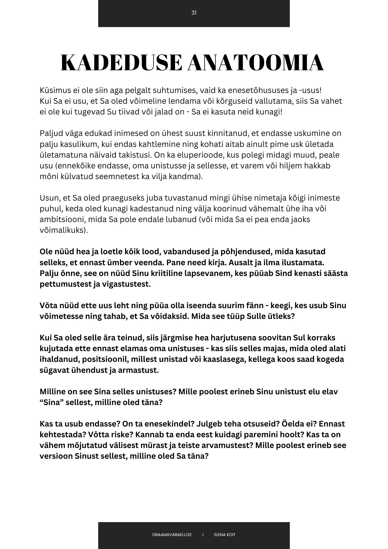 3. Peale makse sooritamist on Sul võimalik oma kontole sisse logida ning seal juba näedki valitud teekonna sisulisi materjale - digiraamatu allalaadimise linki ja salvestusi. Sama kasutajanime ja parooliga saad aasta vältel samale kontole sisse logida.➣ ALTERNATIIVINA VÕID TEHA ÜLEKANDE CONSCIRE OÜ A/A EE342200221074698751 (Swedbank), LISADA SELGITUSSE “KADEDUSE ANATOOMIA” NING SAATA MULLE VASTAVA SISUGA KIRJA kiri@elena.ee .